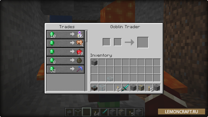 Мод на гоблинов торговцев Goblin Traders добавляет в игру нового моба  с которым вы сможете вести торговлю. Найти гоблина торговца вы сможете только в давно заброшенных подземельях. У данного моба можно приобрести уникальные вещи, которые вы сами никогда бы не смогли найти. Например, вы сможете приобрести книги, с помощью которых сможете зачаровывать предметы на более высокие уровни, чем стандартное зачарование.